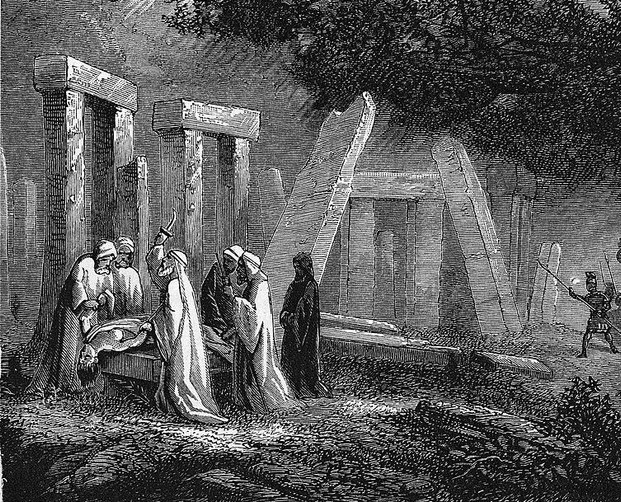 Figure 1: A drawing imagines Roman soldiers (far right) stumbling across a druid sacrifice (Kean Collection/Getty Images)